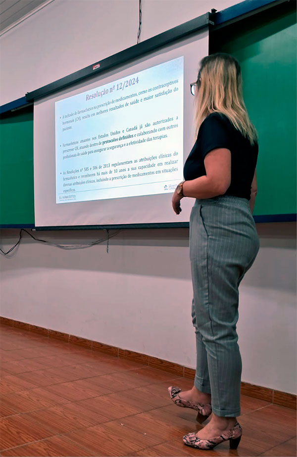 Na ocasião, a Adriana explicou sobre o papel do farmacêutico na farmácia hospitalar e as diferentes atribuições a eles concedidas, instigou os acadêmicos a seguirem a carreira e apontou os desafios do dia a dia.